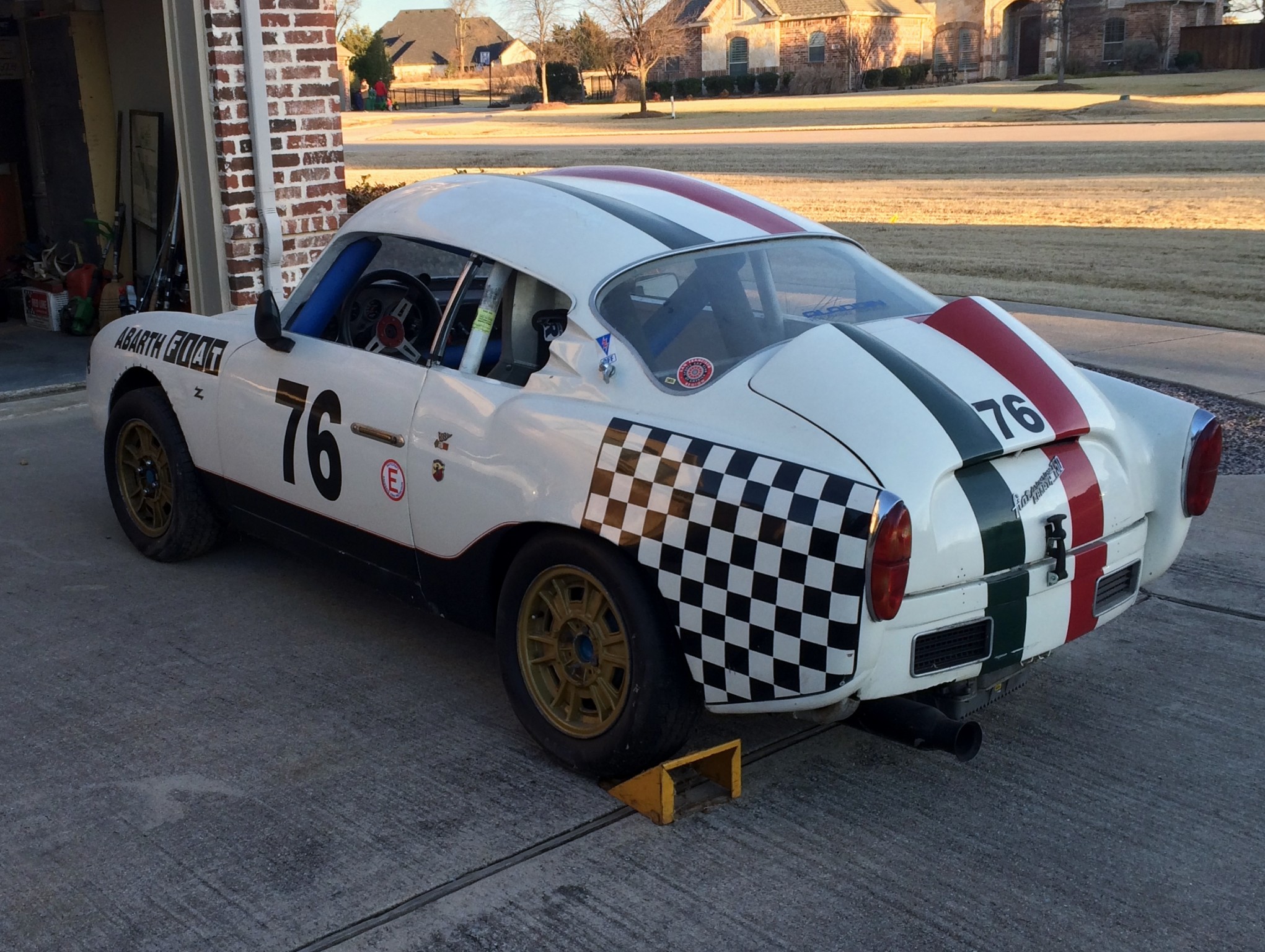 Gold-painted alloy wheels are wrapped in a set of old Avon racing slicks. The suspension has been reworked and now utilizes coilovers at each corner. A fuel cell resides in the front compartment as pictured in the gallery.