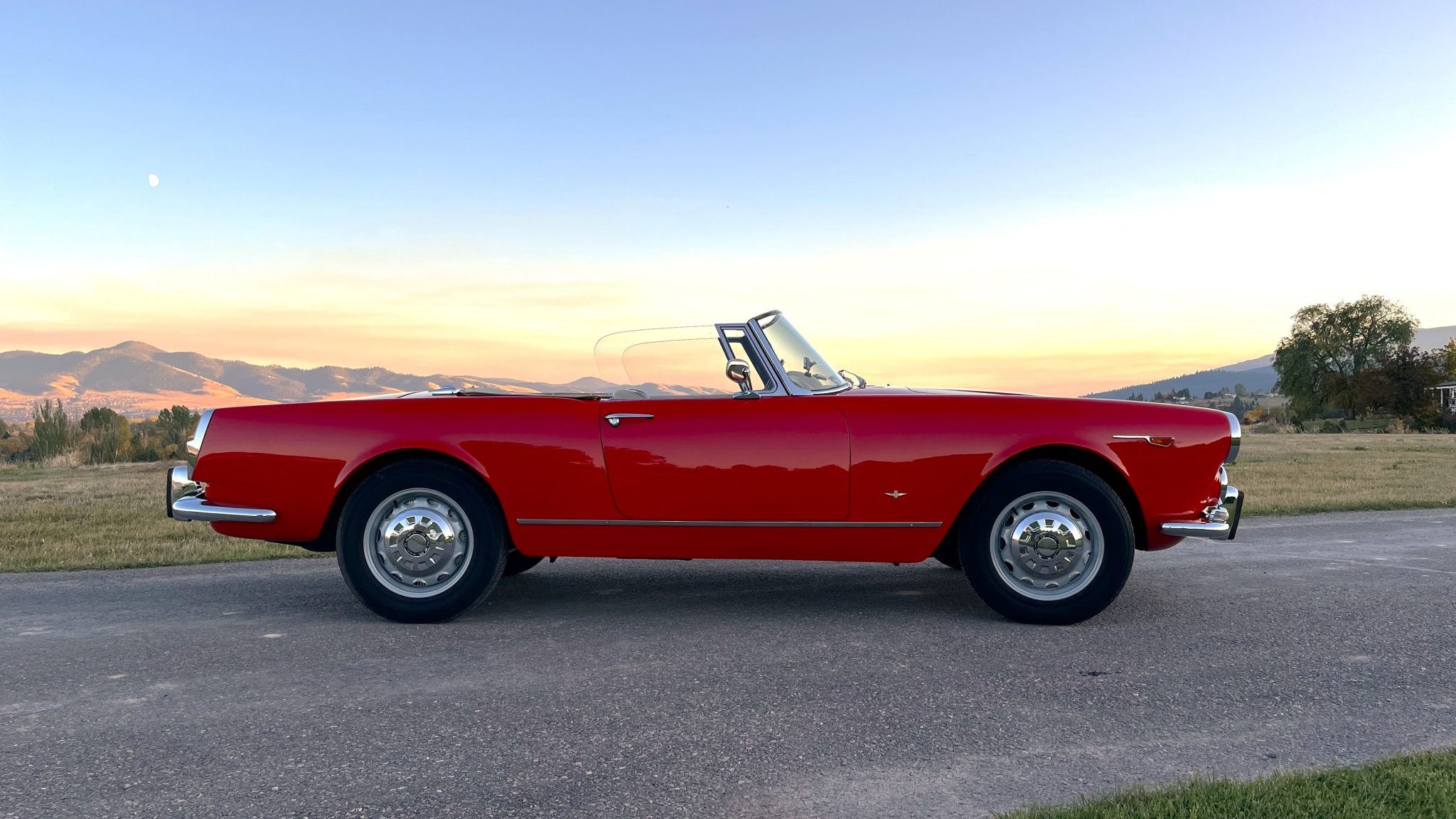 Silver-painted 400mm steel wheels wear chrome Alfa Romeo–branded hubcaps and are mounted with older 165-width Michelin tires. A matching spare wheel and tire are stored in the trunk compartment. The 2600 Spider features a coil-sprung independent front suspension and a live rear axle, and this example has been fitted with adjustable AVO shocks at each corner. Stopping power is provided by front discs coupled with finned rear drum brakes, and service performed since 2021 has involved refinishing the rotors as well as replacing the brake master cylinder, booster, lines, and hoses.