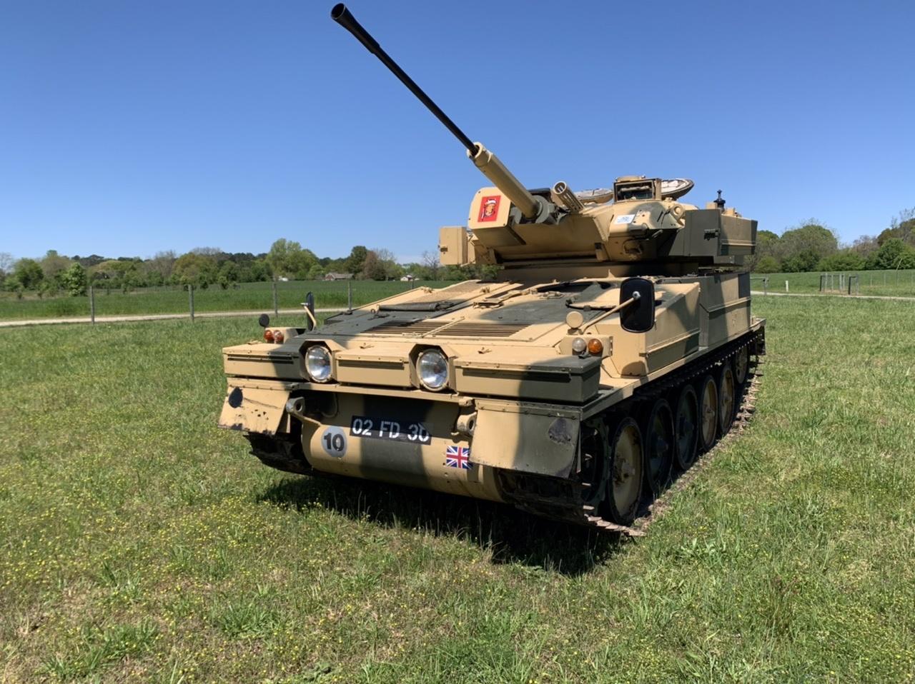 The vehicle is equipped with conventional metal tracks with rubber blocks and is said to be capable of around 50 mph. It is also fitted with dual exterior mirrors, headlights, taillights, and turn signals.