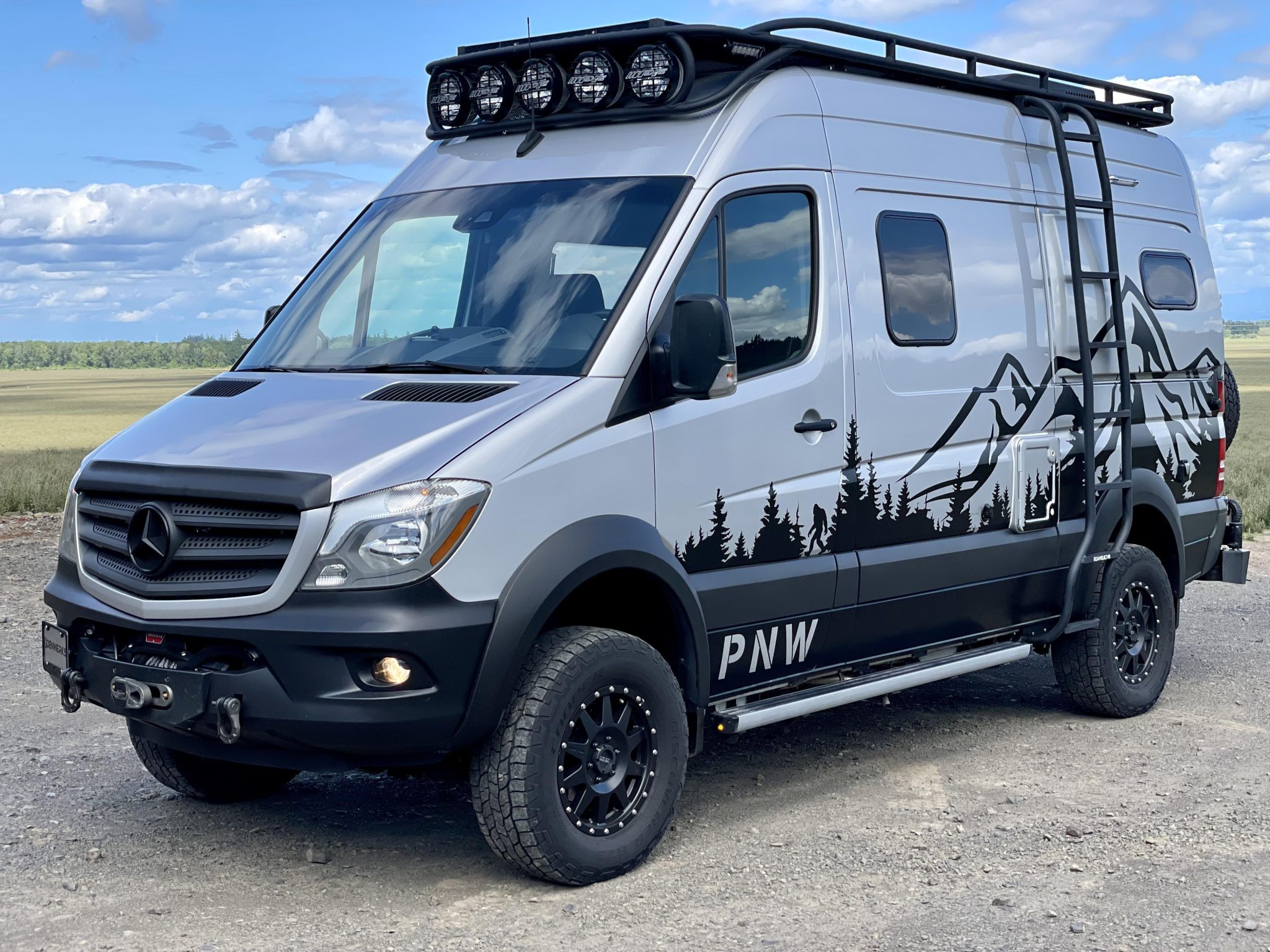 Black-finished 17” Method Race wheels are wrapped in 275/70 Cooper Discoverer AT3 tires showing 2019 date codes, and a matching spare is mounted to the rear swing-away carrier. The van is equipped with a suspension lift, Fox 2.0 Performance Series shock absorbers, and four-wheel disc brakes.