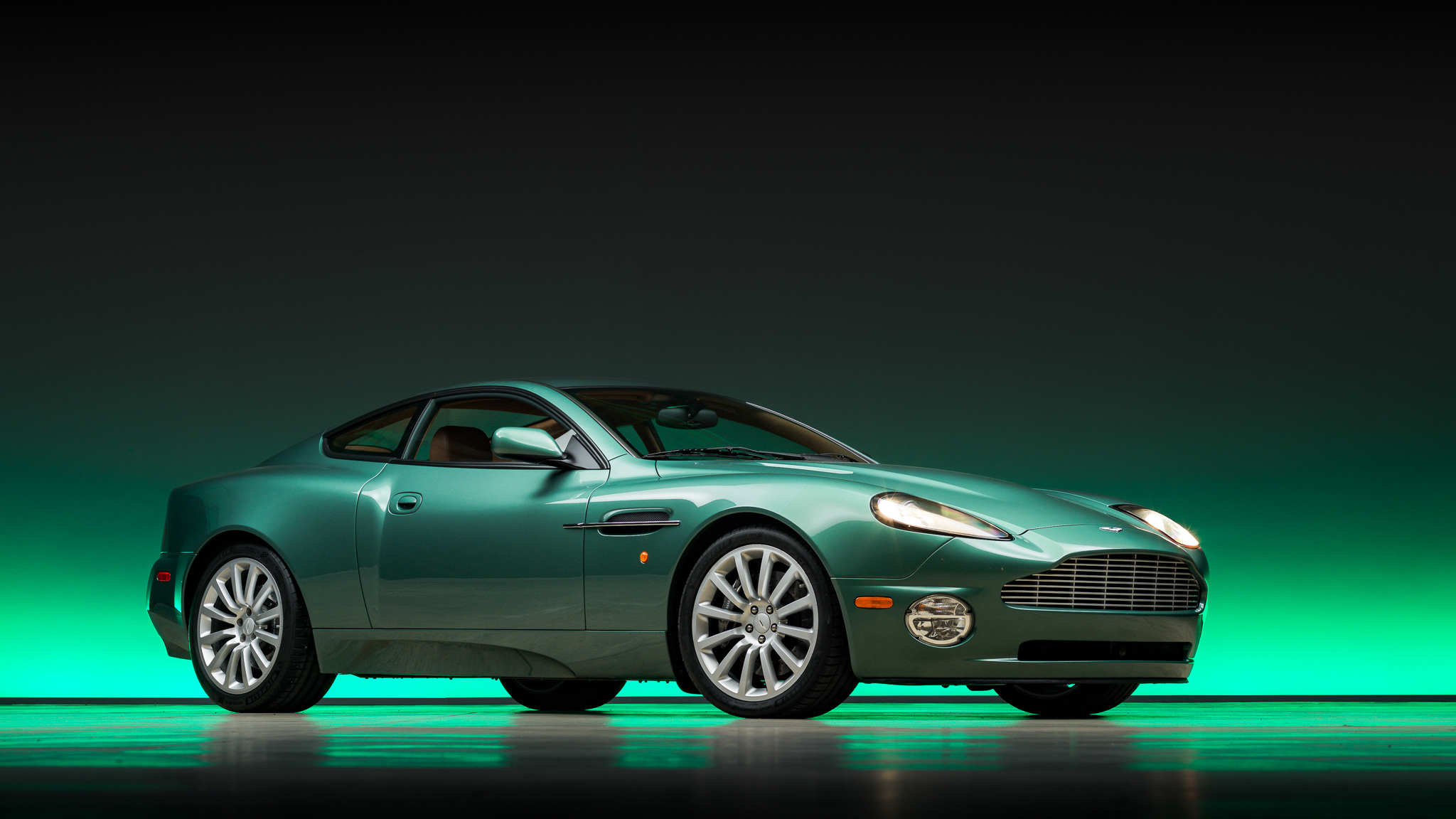 Factory 19″ twelve-spoke alloy wheels wear 265/35 front and 295/35 rear Michelin Pilot Sport 4S tires showing 2022 date codes. Braking is handled by gray Aston Martin-branded four-piston calipers with cross-drilled rotors all around.