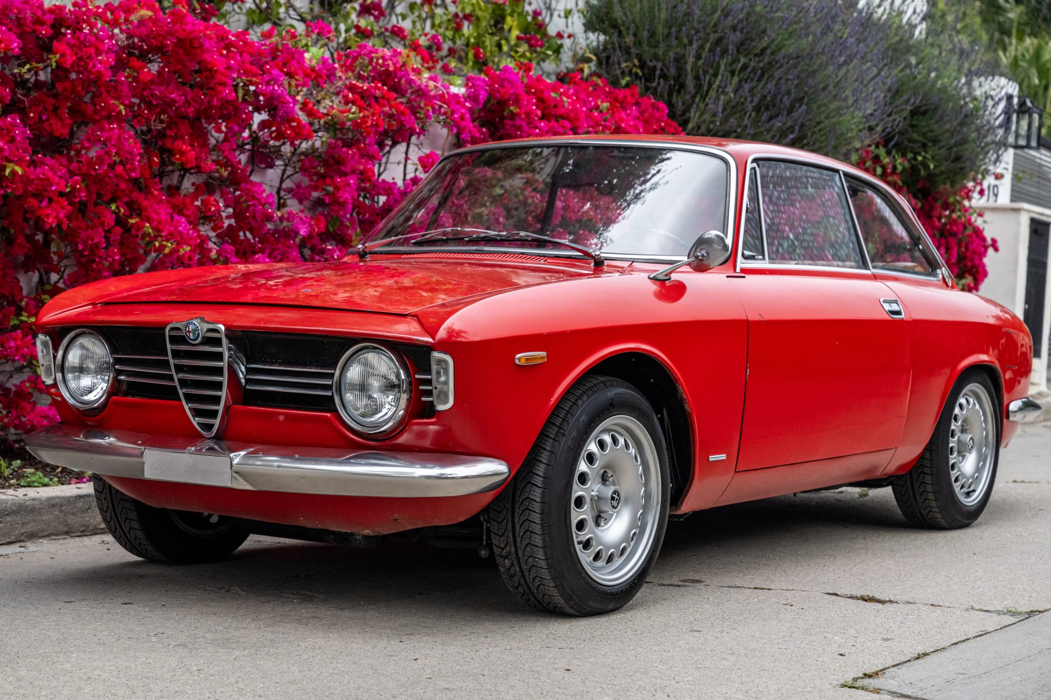 Silver 15″ Alfaholics GTA-style alloy wheels are mounted with 185/60 Pirelli P4 Four Season Plus tires, and a 14″ spare with an older Continental tire is stored in the trunk. The suspension has been modified with an Aflaholics front sway bar as well as their Fast Road springs paired with Koni yellow front and red rear shocks. The four-wheel disc brakes were reportedly overhauled under prior ownership including replacement of the booster and calipers.