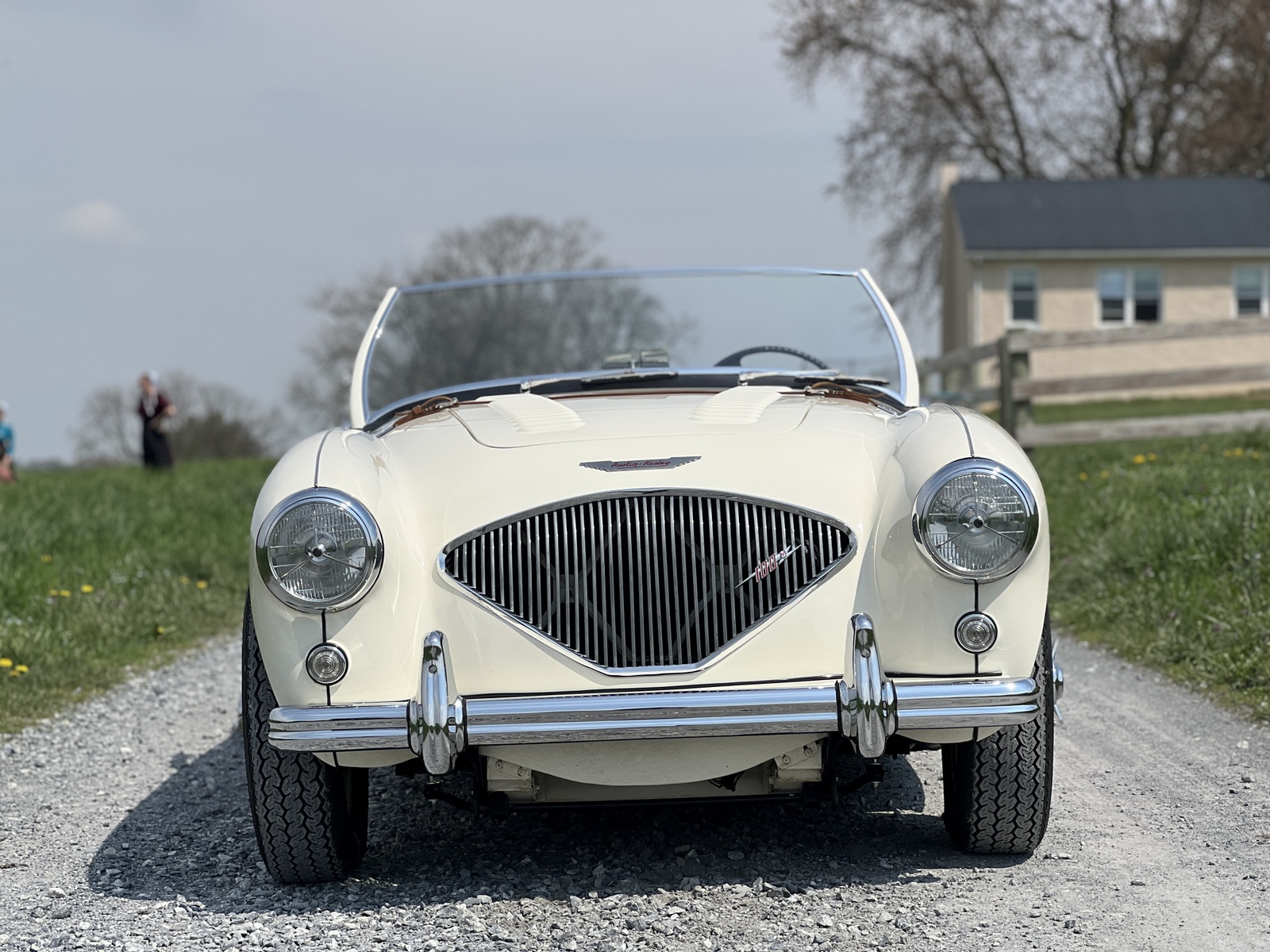 White 15” knock-off wire wheels are retained with chrome spinners, and Vredestein Sprint Classic tires were mounted in October 2023. A matching spare wheel wrapped in an older Michelin tire is stored in the trunk. The 100M featured a double-wishbone front suspension with stiffened coil springs and an upgraded anti-roll bar. Braking is handled by drums at all four corners. Work performed in 2023 involved rebuilding the front and left rear shocks, installing ¾”-bore rear wheel cylinders, and replacing the right-front wheel cylinder as well as the shoes all around.