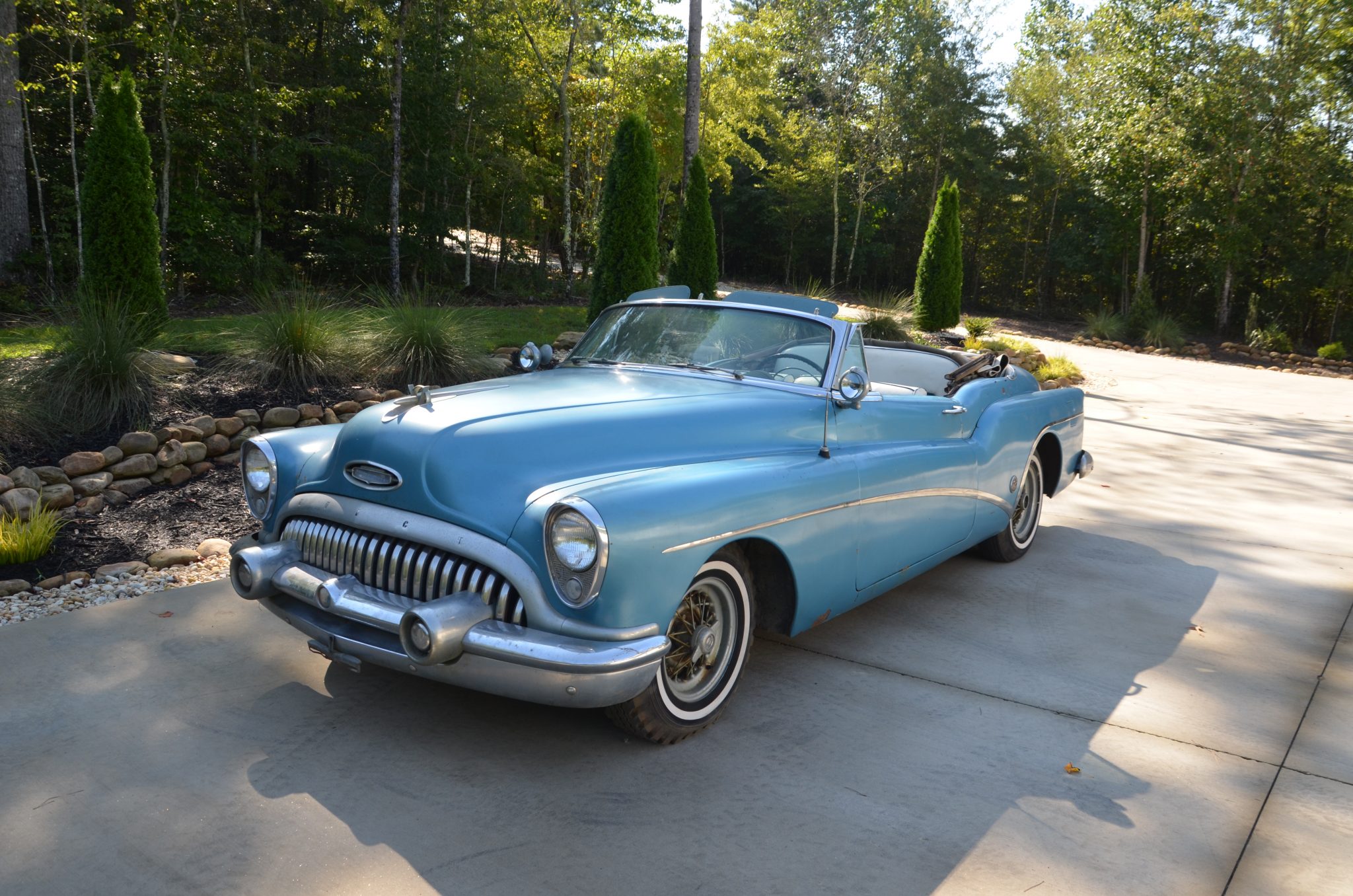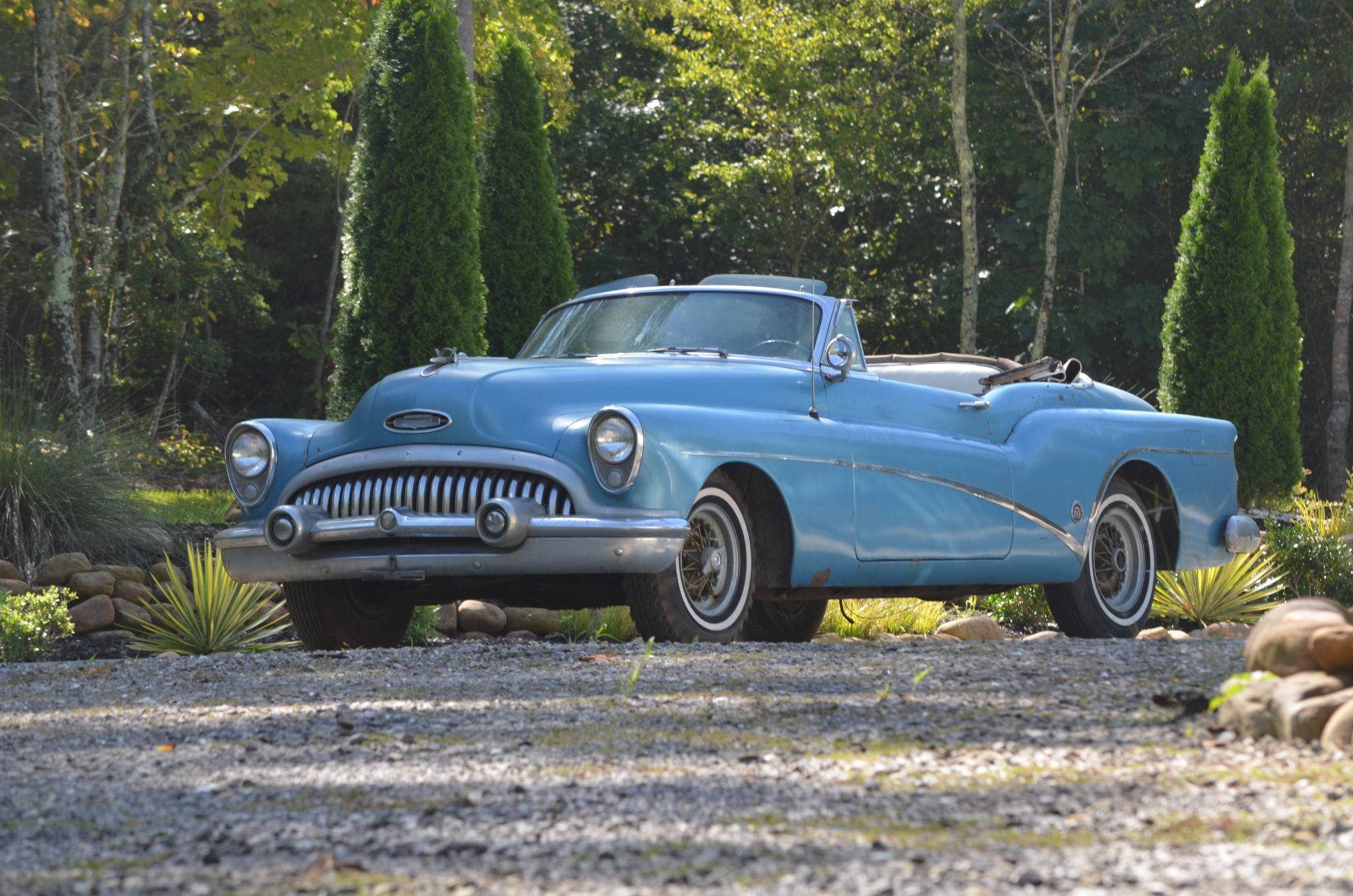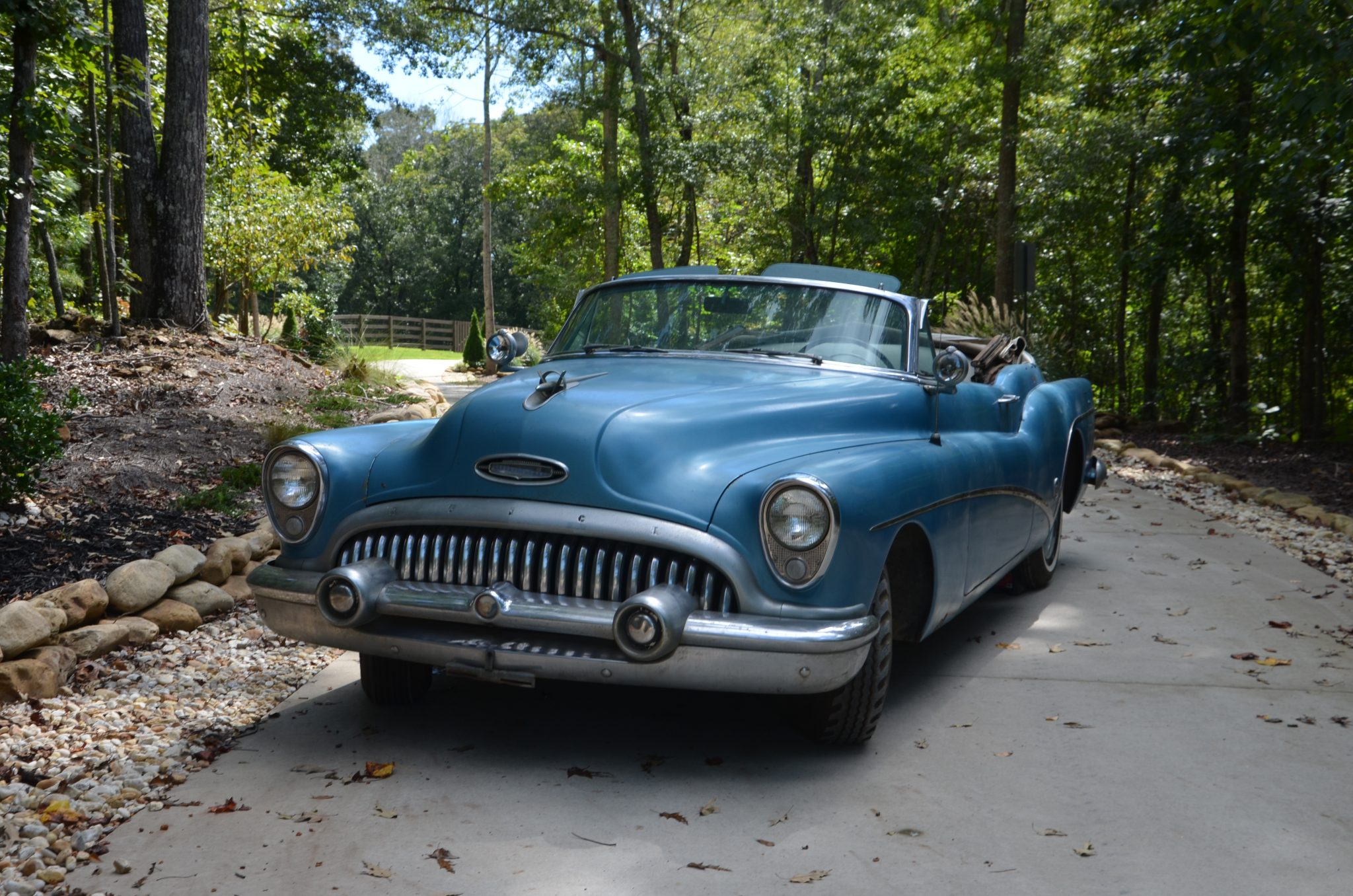 Simulated knock-off wire wheels are wrapped in mismatched narrow-whitewall tires, and corrosion on the wheels can be viewed in the gallery. The car is equipped with power-assisted drum brakes and power steering.