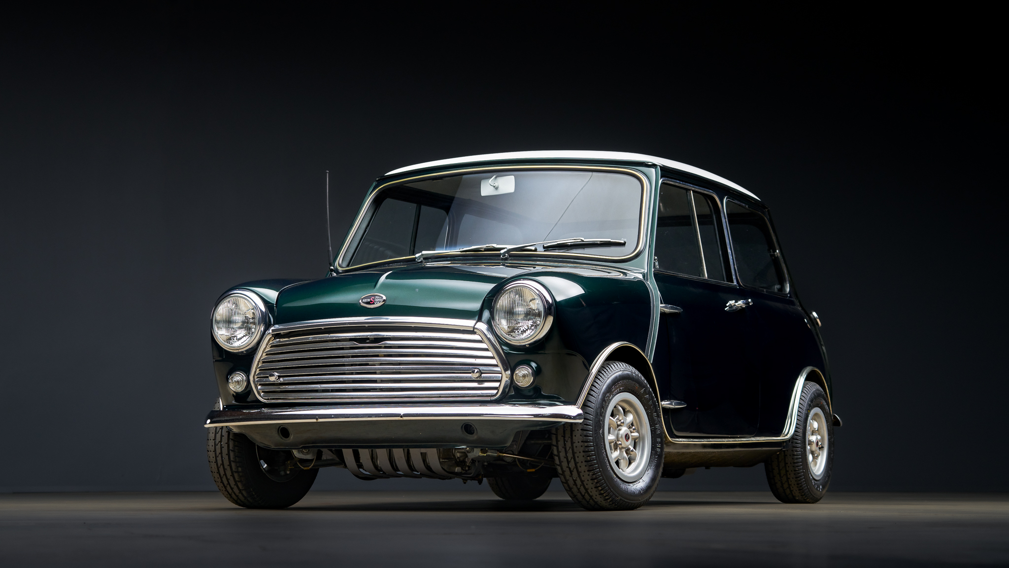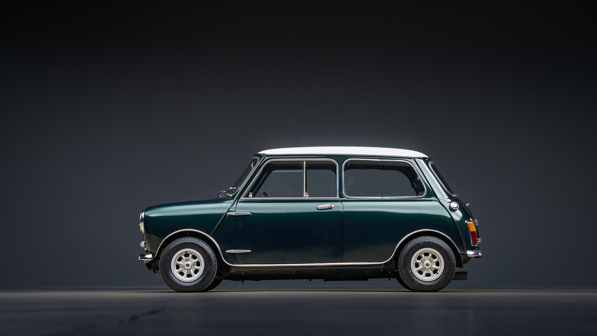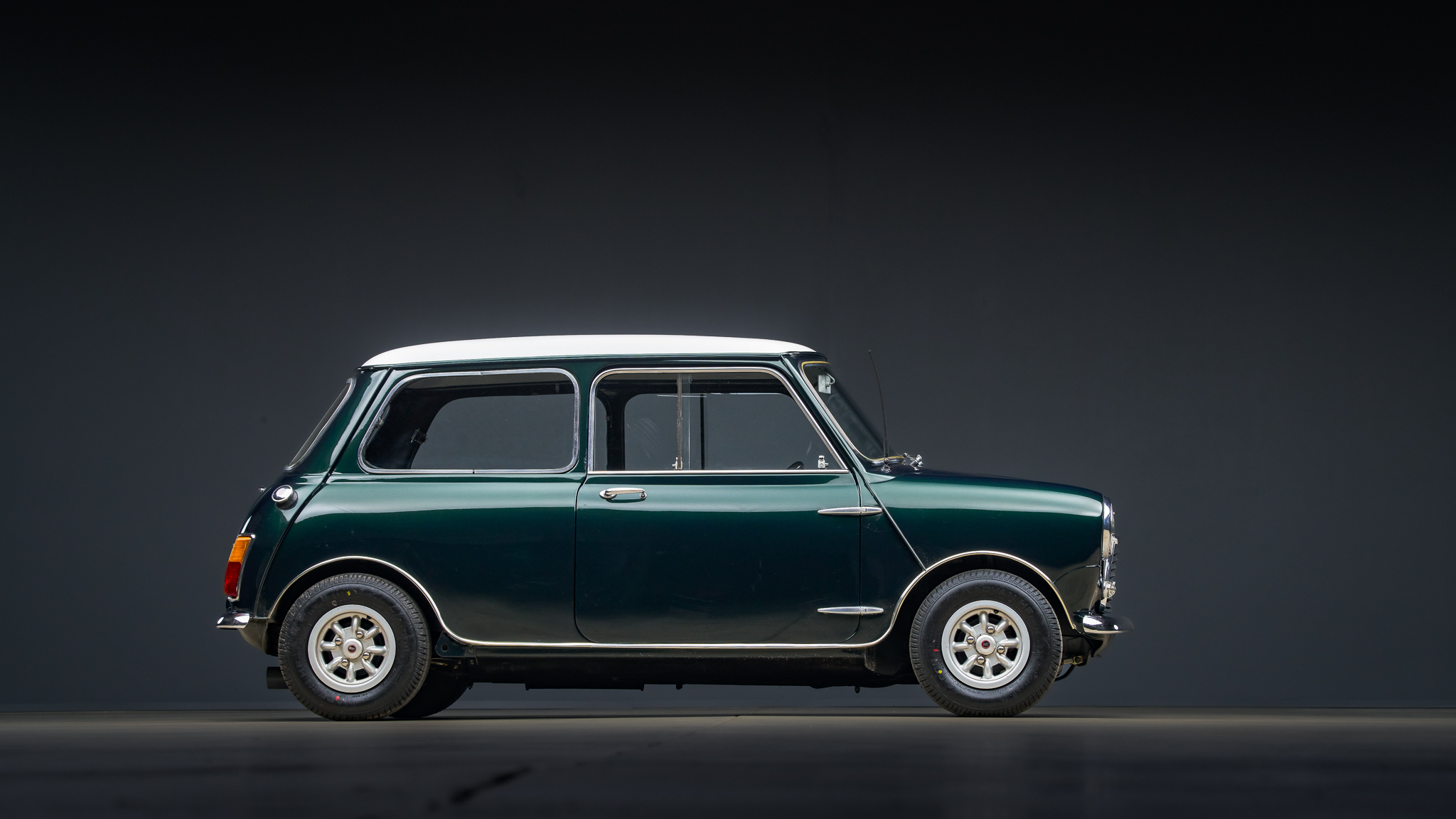 Minilite-style 10” alloy wheels were mounted with 135-series Yokohama Advan HF tires in March 2023. The trunk houses an older Yokohama spare on a steel wheel. The factory Hydrolastic suspension was removed, and stopping power is provided by disc brakes up front and drums out back. The rear wheel cylinders were replaced and the brake fluid flushed in March 2023.