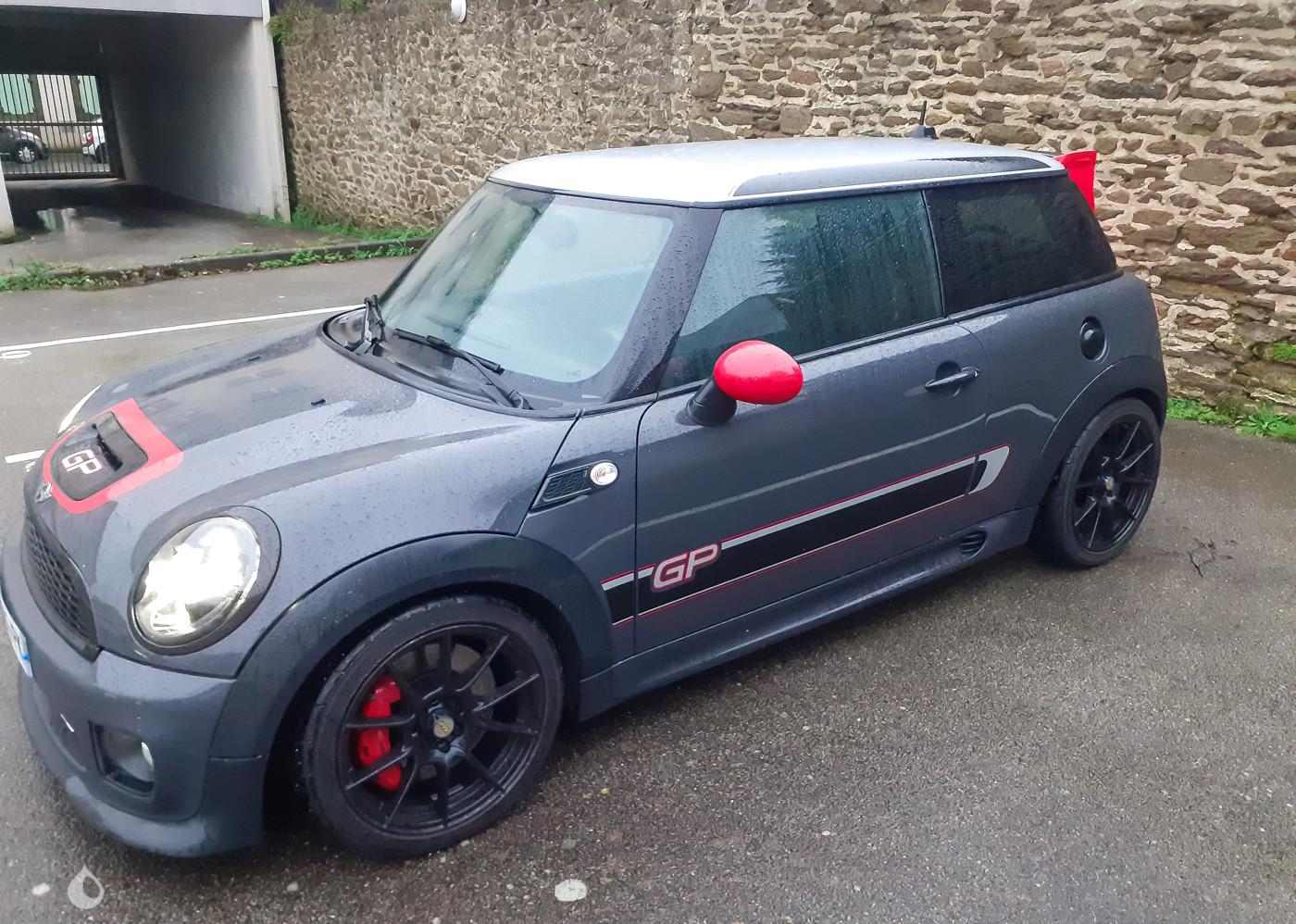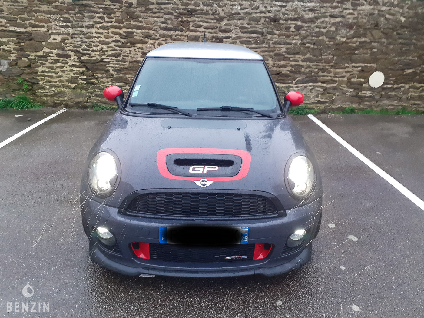 On the outside, the car is in very good condition. The original paint in its specific grey "Thunder Grey metallic" color has only very few visible defects in the gallery. The exterior plastics and seals are in good condition, as well as the headlights. The seller indicates that this Mini is free of corrosion. He also states that the car is fully original on the outside and has the GP specific elements (front skirt, rear bumper, rocker panels and roof spoiler)